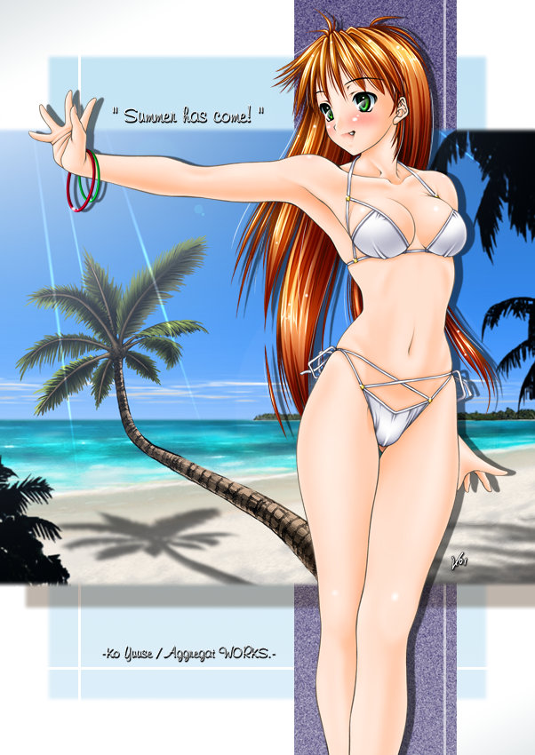 beachbikinifanggreen eyeslong hairmidriffnavelorange hairpalm treeside-tie bikini bottomsoloswimsuittreewhite bikini