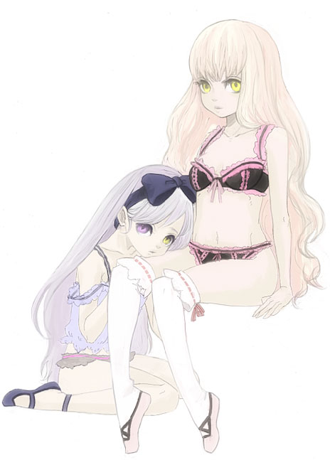 2girlsblonde hairbrahair ribbonheterochromiakneehighskneelinglingerielong hairmultiple girlspantiespurple hairribbonsocksunderwearunderwear onlyyellow eyes