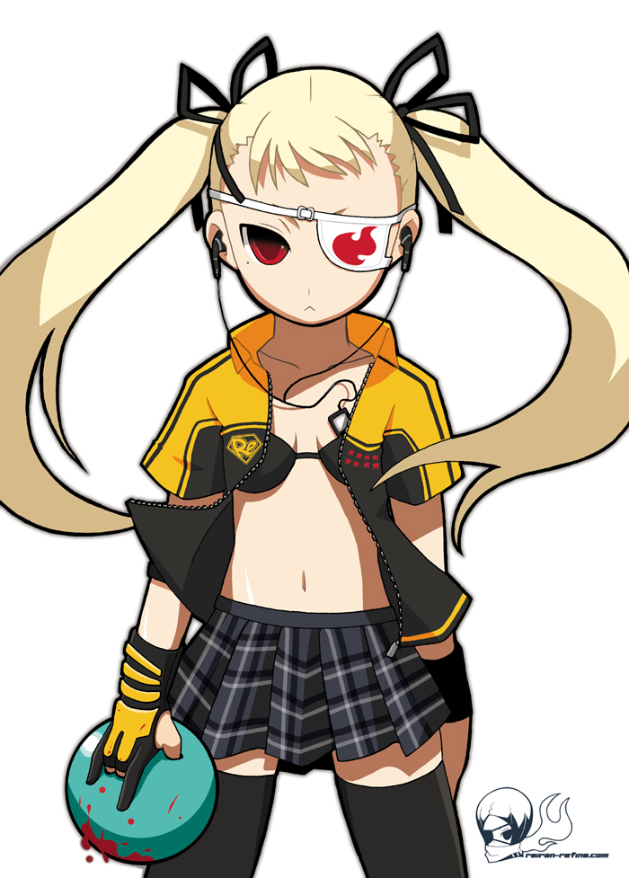 ballblonde hairbloodbowling balldigital media playereyepatchglovesjacketmidriffplaid clothesplaid skirtred eyesskirtsolothighhighstrack jackettwintailszettai ryouiki
