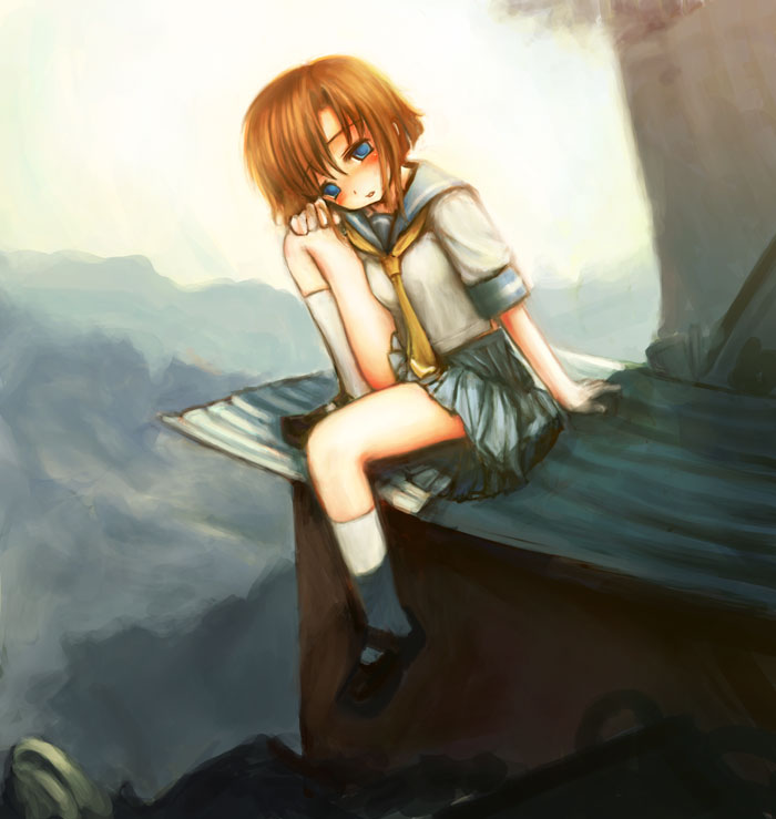 kawashiro nitori, touhou, lowres, 1girl, :o, backpack, bag, blue dress, blue eyes, blue hair, blush, dress, fall, female focus, hat, key, leaf, long sleeves, looking at viewer, matching hair/eyes, outdoors, parted lips, plant, randoseru, river, rock, shore, solo, tree, two side up, water