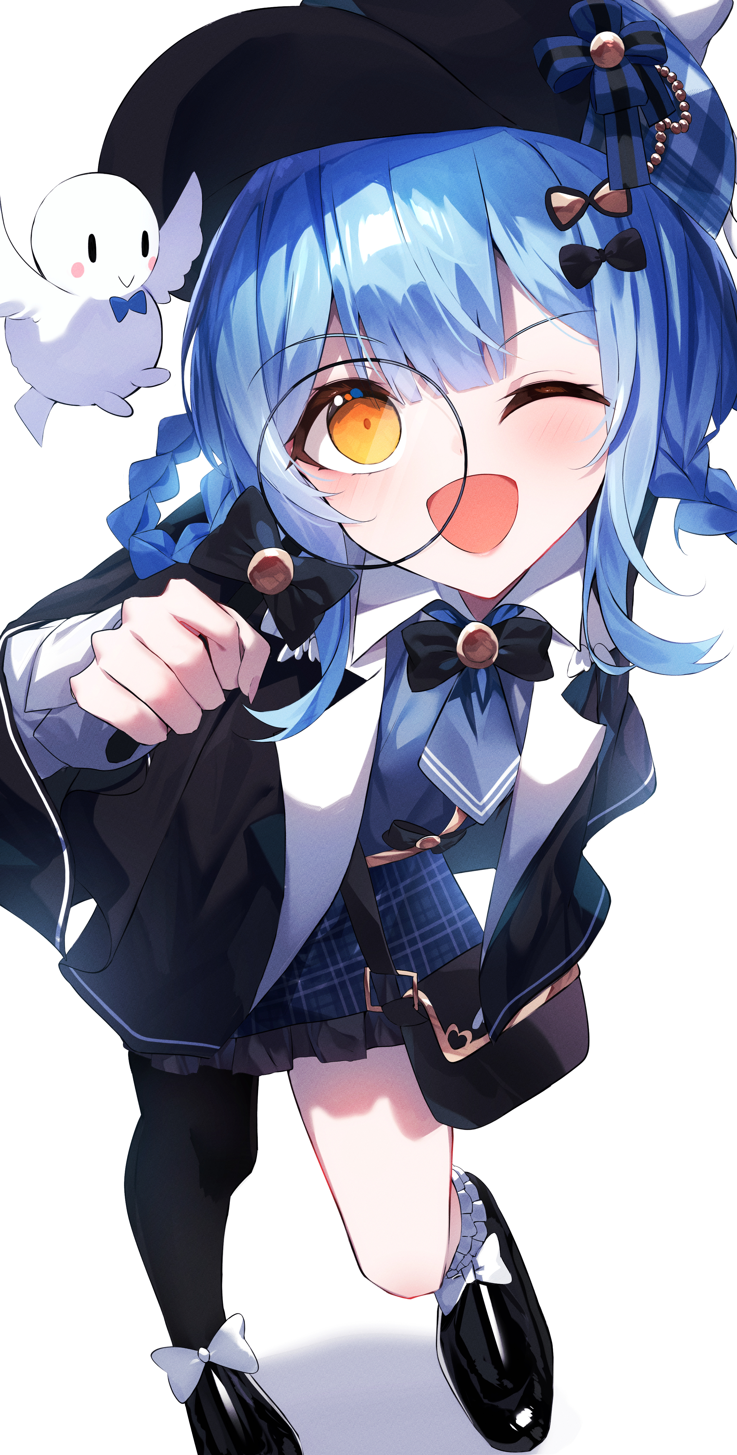 :d1girlbirdblack bagblack bowblack capeletblack hatblack shoesblue hairblue necktieblue skirtblunt bangsbowbraidbraided hair ringscapeletcollared shirtdeerstalkerdetectivefrilled skirtfrillsfrom abovefull bodyhair ringshatholdingholding magnifying glassloaferslong sleeveslooking at viewermagical girlmagnifying glassnecktieone eye closedopen mouthshirtshoessimple backgroundskirtsmilesolostandingwhite backgroundwhite shirtyellow eyes