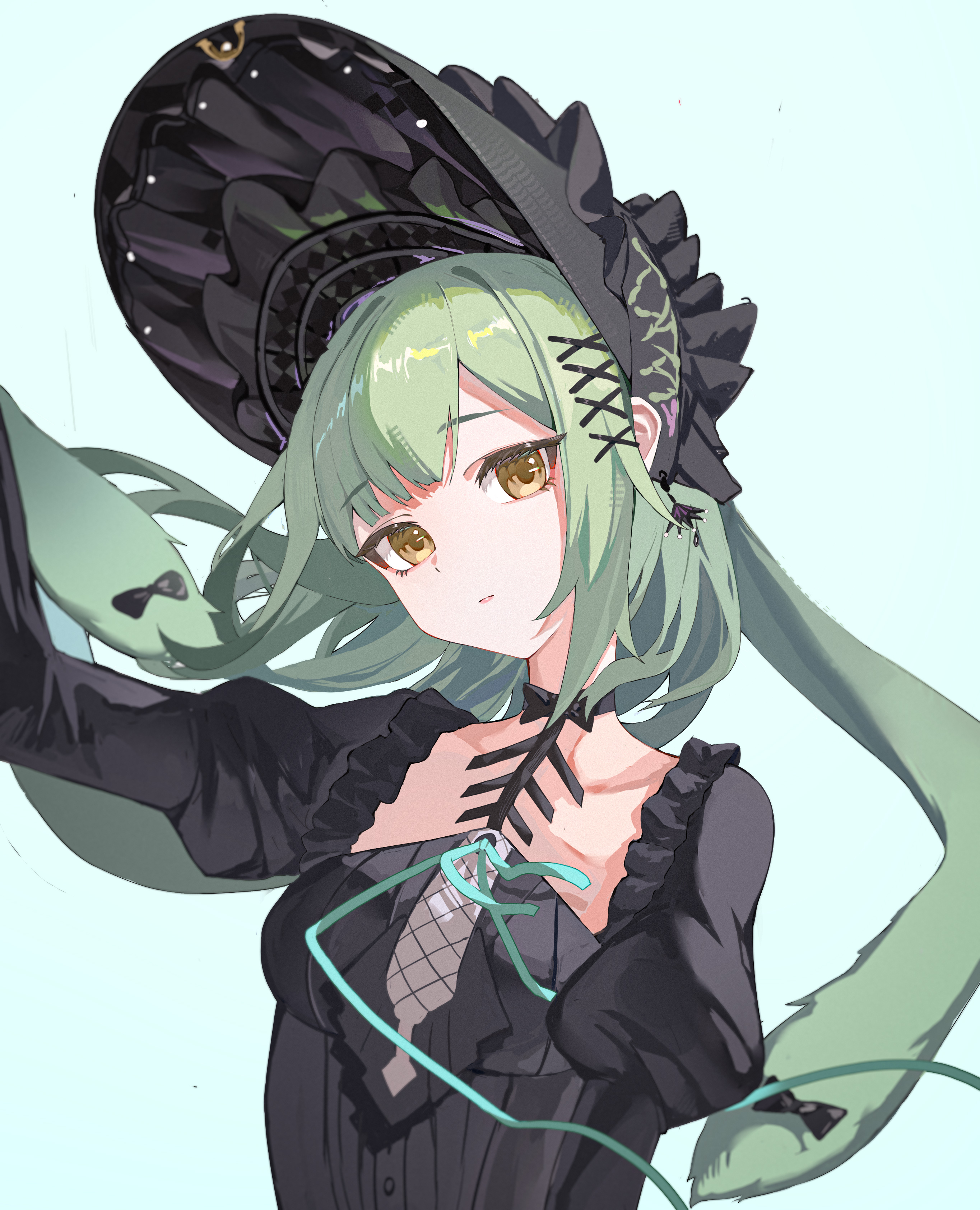 1girlanimal earsarm upblack bonnetblack bowblack chokerblack dressbonnetbowchokerclosed mouthdressexpressionlessfloating hairfloppy earsgothic lolitagreen hairhair ornamentjuliet sleeveslai wan ting regoulolita fashionlong hairlong sleeveslooking at viewerpuffy sleevesrabbit earsrabbit girlsidelockssimple backgroundsoloupper bodywhite backgroundx hair ornamentyellow eyes