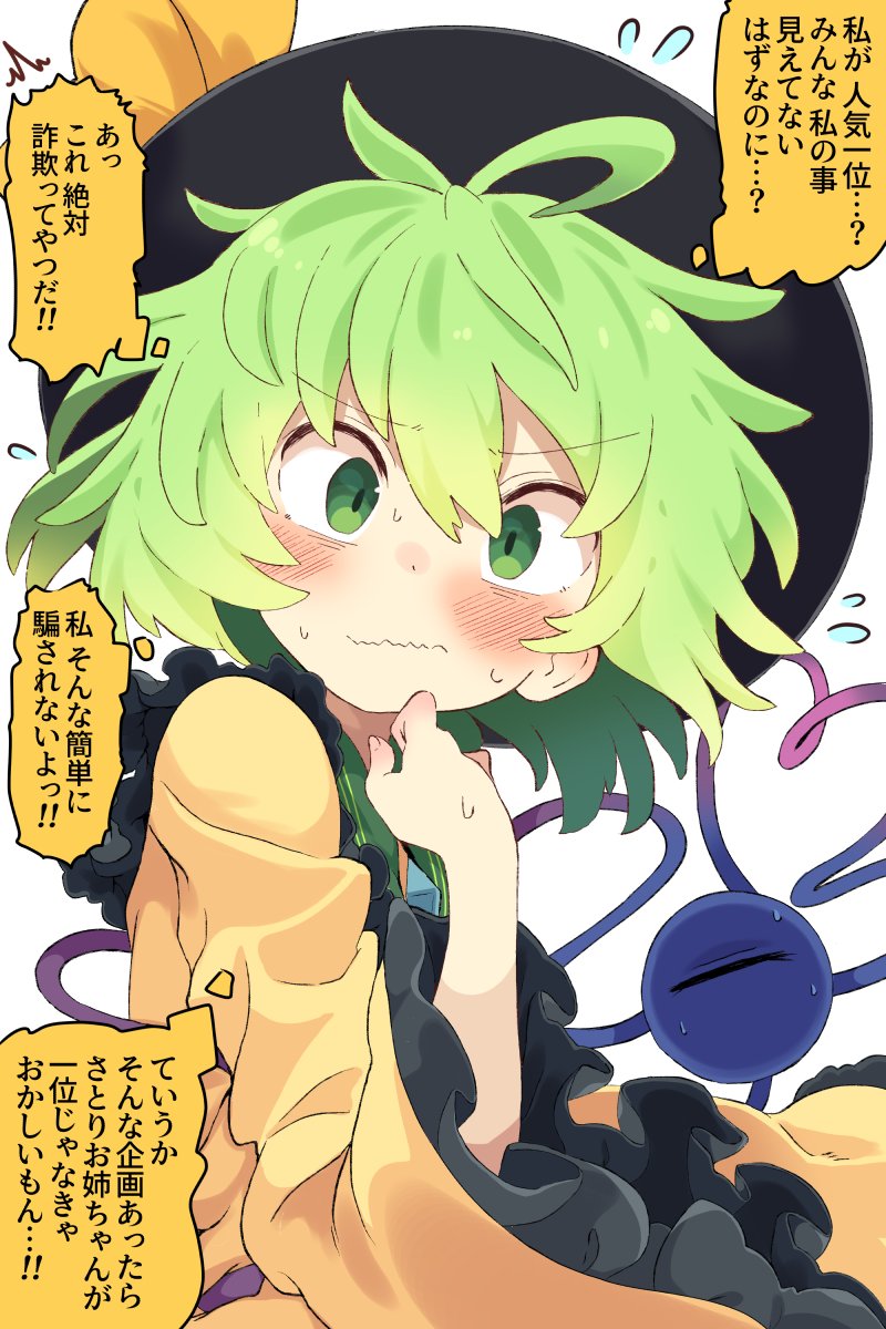 1girlblushgreen eyesgreen hairlooking at viewernervousshirtshort hairsolospeech bubblesweatthird eyewhite backgroundwide sleevesyellow shirt
