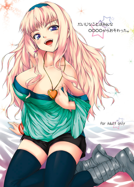 00s1girlbare shouldersblunt bangsbootsbreastscleavagefemale focushairbandjewelrylarge breastslong hairnecklaceopen mouthpink hairpurple eyesshortssittingsolothighhighs
