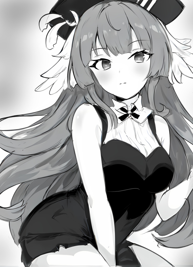1girlbare shouldersbird girlblack romperblushbreastsfeather hairgreyscalehathat featherhead wingslong hairlooking at viewermedium breastsmonochromerompershirtsimple backgroundsleevelesssleeveless shirtsolowings
