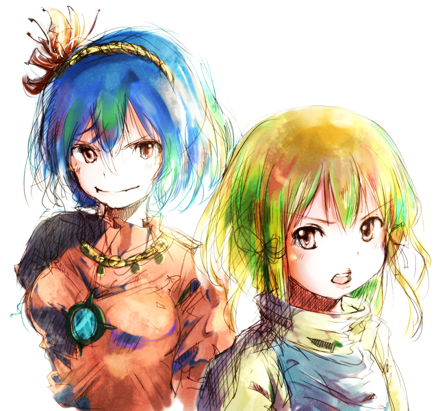 sfrabbit, original, highres, 2boys, black hair, brown hair, field, holding hands, hood, hood down, hoodie, lake, low ponytail, male focus, multiple boys, outdoors, pants, ponytail, shirt, short hair, short ponytail, short sleeves, smile, water