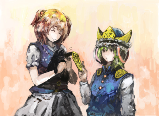 1boy2girlsanimalblue dresscatclosed eyesdressexpressionlessfemale focusgreen eyesgreen hairhatholdingjitomelong sleevesmob capmultiple girlsobipuffy short sleevespuffy sleevesred hairrod of remorsesashshort sleevessimple backgroundtwintailstwo side upupper body