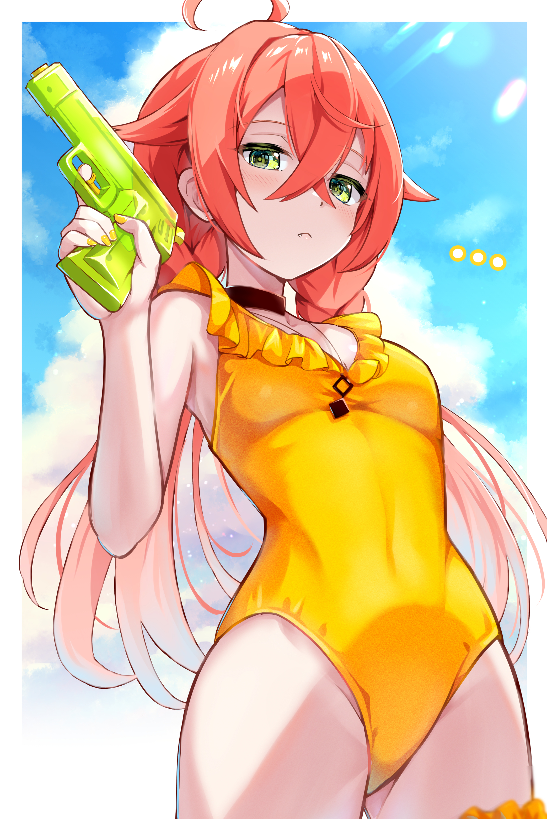 1girlahogebare shouldersblack chokerbreastschokerclosed mouthcovered navelcowboy shotfrilled one-piece swimsuitfrillsgreen eyeshair between eyesholdingholding water gunlong hairlooking at viewerone-piece swimsuitorange hairsmall breastssoloswimsuitvirtual youtuberwater gunyellow one-piece swimsuit