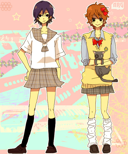 00s2boys2girlsblack hairblack socksbrown haircrossdressingfull bodygrey skirthand on own hipkneehighsleg warmerslooking at viewermultiple boysmultiple girlsplaid clothesplaid skirtpleated skirtsailor collarschool uniformserafukushort hairskirtsocksstanding