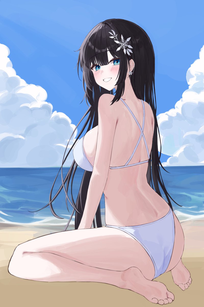 1girlassbackbare shouldersbarefootbeachbikiniblack hairblue eyesdayfrom behindgrinhair ornamentlong hairlooking at viewerlooking backmedian furrowoutdoorssittingsmilesnowflake hair ornamentsolostring bikiniswimsuitvery long hairvirtual youtuberwarizawhite bikini