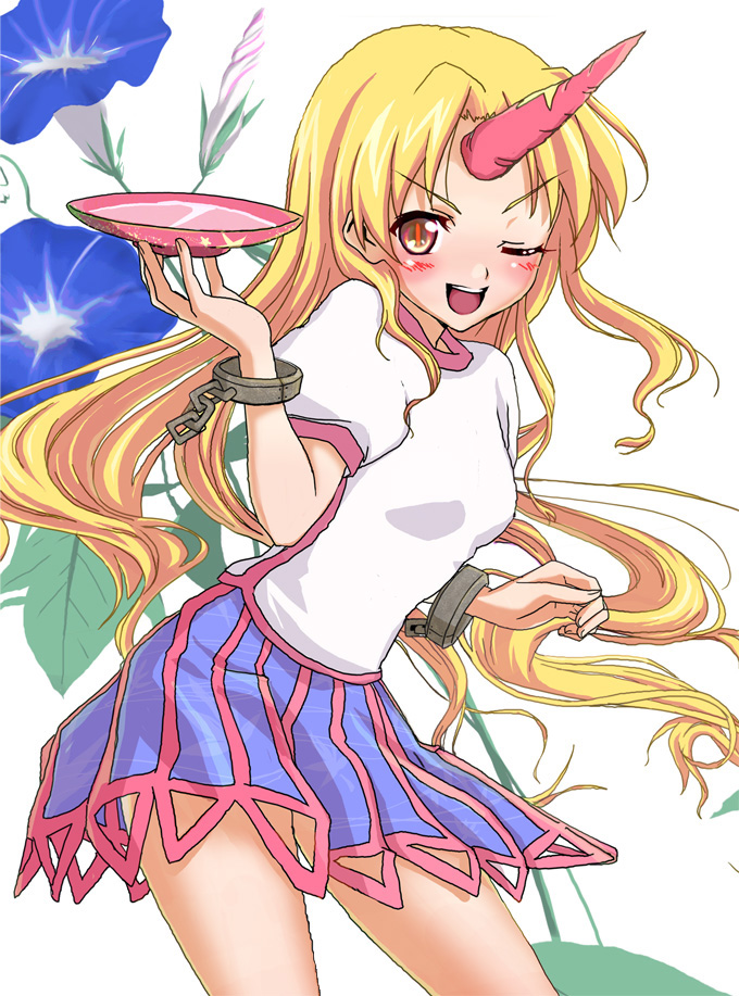 1girlblonde hairblousechaincupfemale focushornslong hairparted bangssakazukishirtsingle hair intakesingle hornskirtslit pupilssolostriped clothesstriped skirtv-shaped eyebrowsvertical-striped clothesvertical-striped skirtwhite shirt