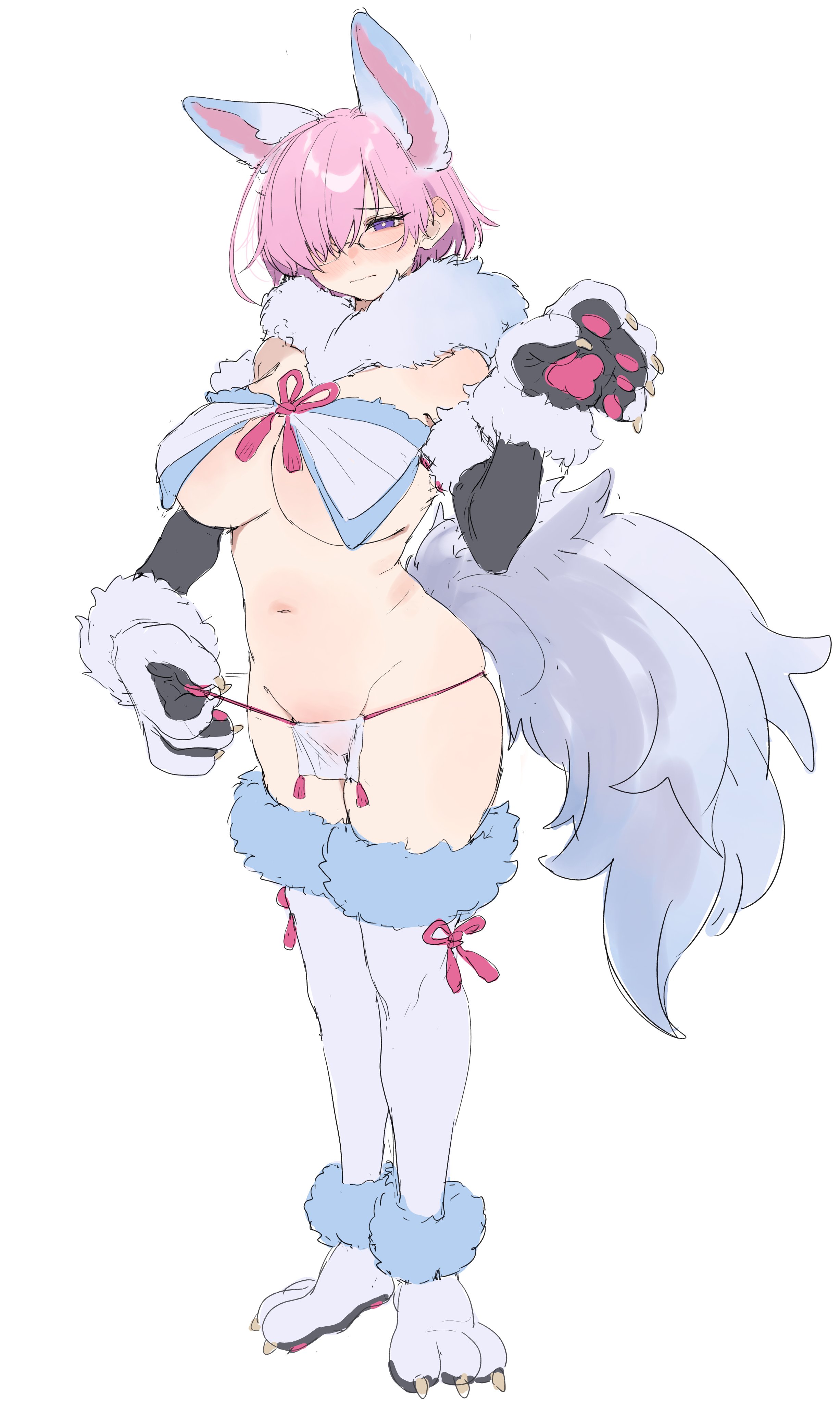 1girlanimal earsanimal handsbare shouldersblushbreast curtainsbreastscleavagecosplayelbow glovesfou (fate) (cosplay)full bodyfur collarfur trimglassesgloveshair over one eyelarge breastslooking at viewernavelpaw glovespaw shoespelvic curtainpink hairpurple eyesshort hairsolotailthighhighswhite thighhighs