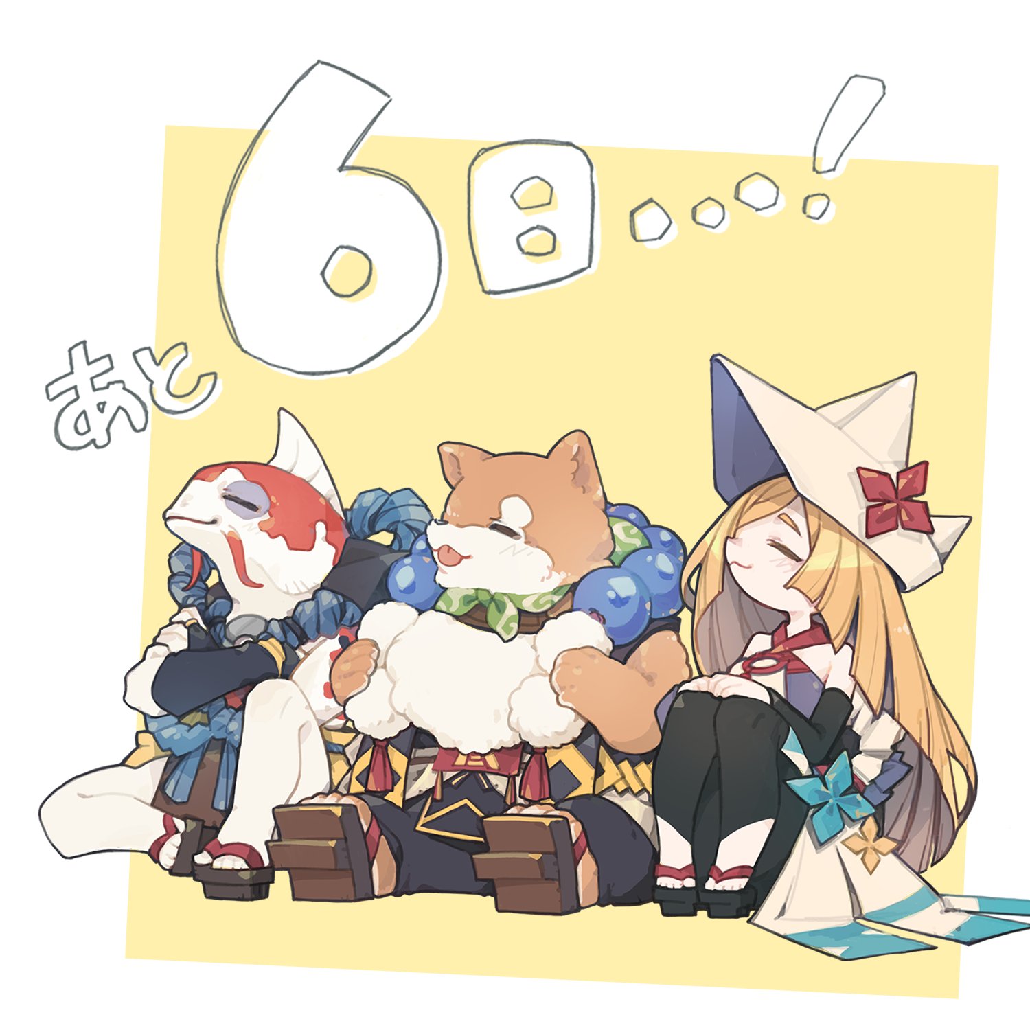 1girl2boysanimal handsbampuku (towa and the guardians of the sacred tree)bare legsbare shouldersbead necklacebeadsblack arm warmersblack bridal gauntletsblack leotardblack pantsblack sandalsblue sleevesblunt endsbraceletbridal gauntletsbrown furbrown loinclothbrown sandalsclosed eyesclosed mouthcolored skincountdown illustrationcriss-cross haltercrossed armsdogdog boyfinsfishfish boyfuroshikifuroshiki around neckgetagold braceletgold ringhalterneckhathead finsimpastojewelryknees together feet apartlegs apartleotardlong hairlong skirtmiddle ringmulticolored skinmultiple boysnakanishi tomokanecklacenishiki (towa and the guardians of the sacred tree)o-ringorange skinorigami (towa and the guardians of the sacred tree)pantspaper hatpleated skirtpom pom (clothes)profileropesandalsshimenawaside-by-sidesimple backgroundsingle sleevesittingskirtsmilestoleswept bangstengu-getatonguetongue outtowa and the guardians of the sacred treetwo-tone furtwo-tone skinwhite furwhite hatwhite skinyellow background