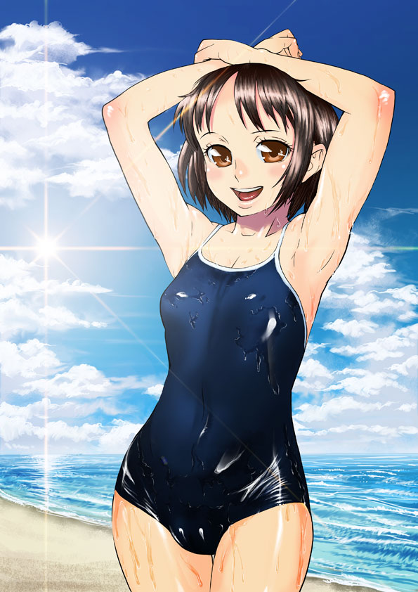 1girlarmpitsbeachblushbrown eyesbrown hairclouddayfemale focusoceanone-piece swimsuitoutdoorsschool swimsuitshort hairskysolosunswimsuitwet