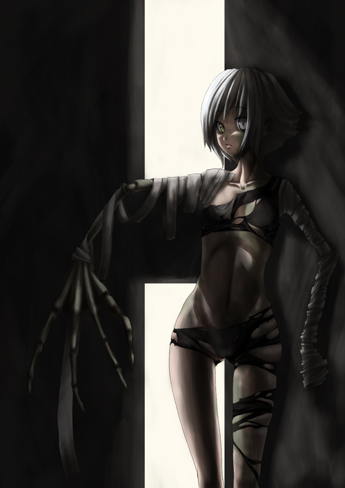 1girlbandagesfemale focusflat chestheterochromiamonster girlshort hairskeletonskinnysolothigh gapthighstorn clotheswhite hair