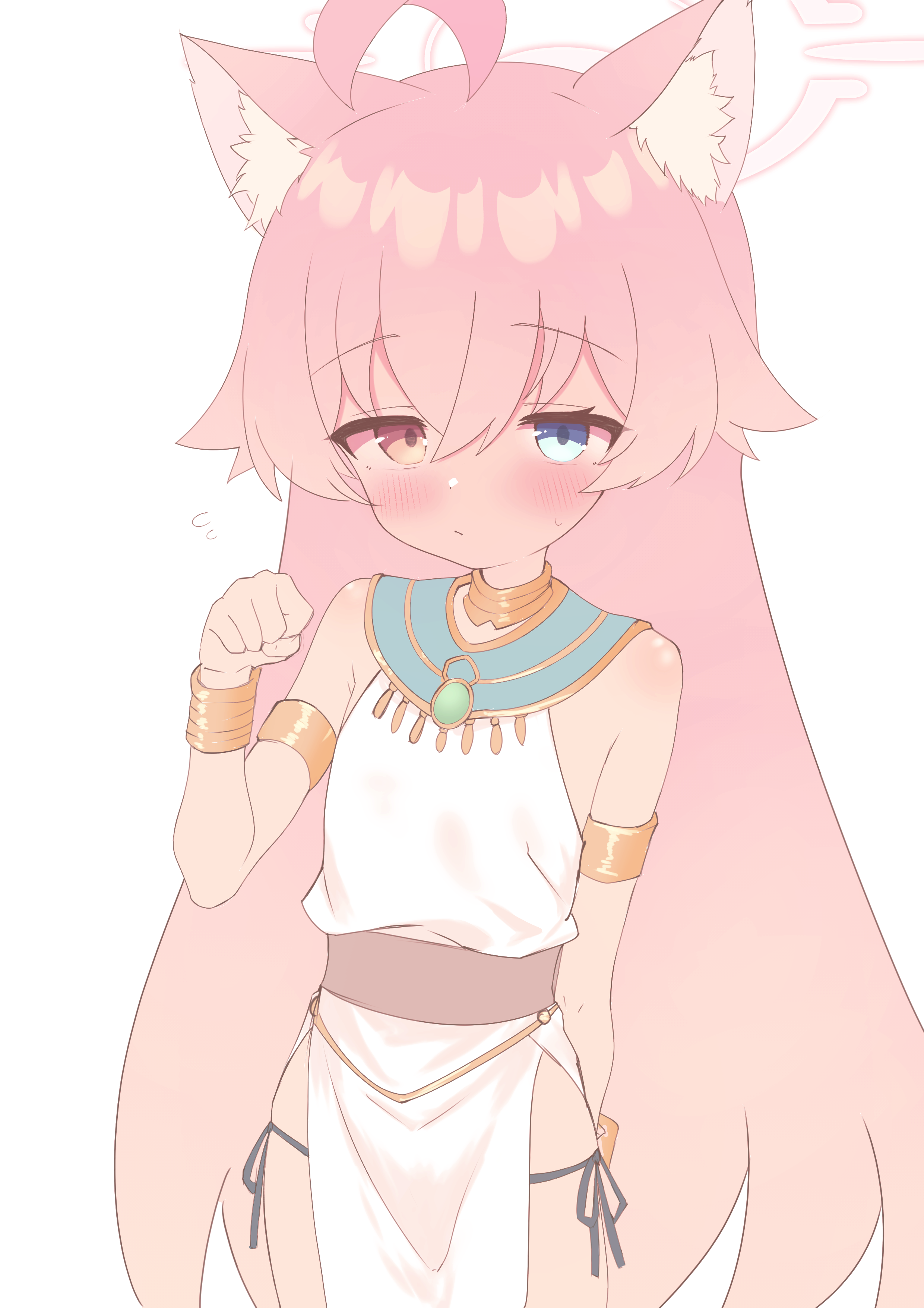 1girlahogeancient egyptianancient egyptian clothesanimal earsblue eyesblushcat earshaloheterochromiaif you want to become a godly artist (trend)long hairpink hairsimple backgroundsolowhite background