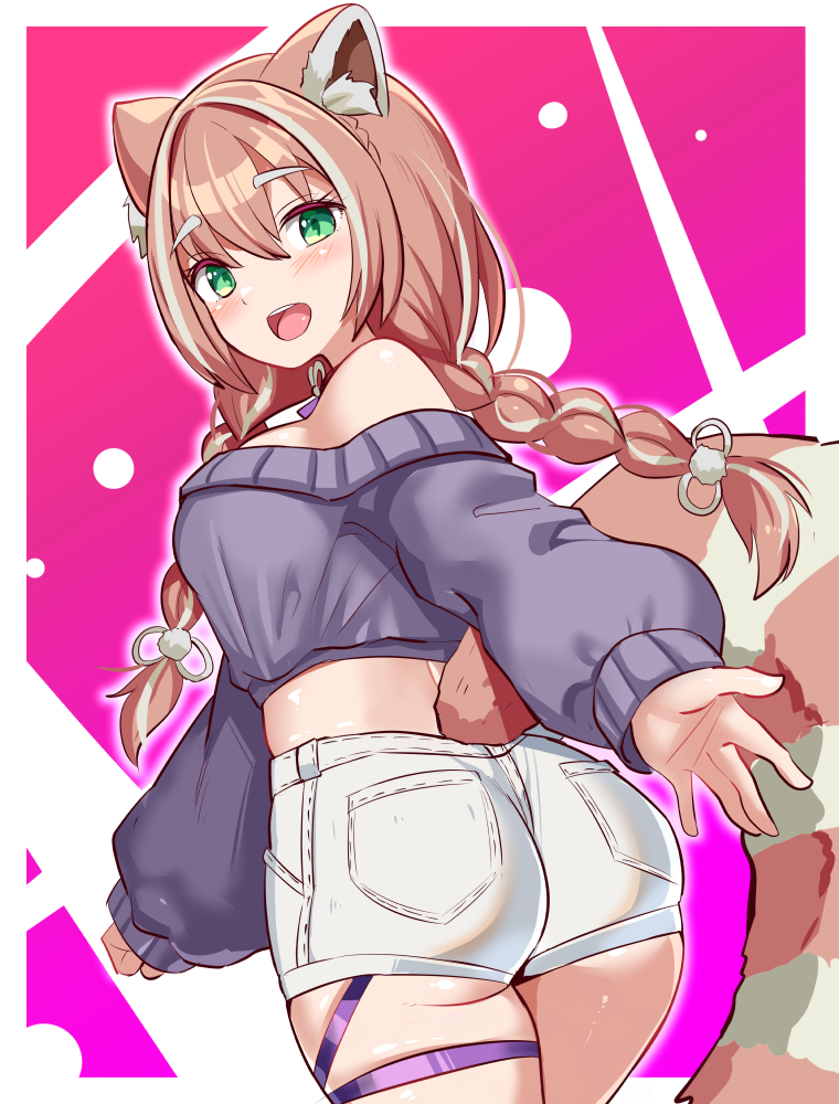 1girlanimal earsassbare shouldersblushbraidbreastsbrown haircrop topfrom behindgreen eyeshair ornamentlong hairlooking at viewerlow twin braidsopen mouthraccoon earsraccoon girlraccoon tailshort shortsshortssideboobsmilesolotailtwin braidsvery long hair