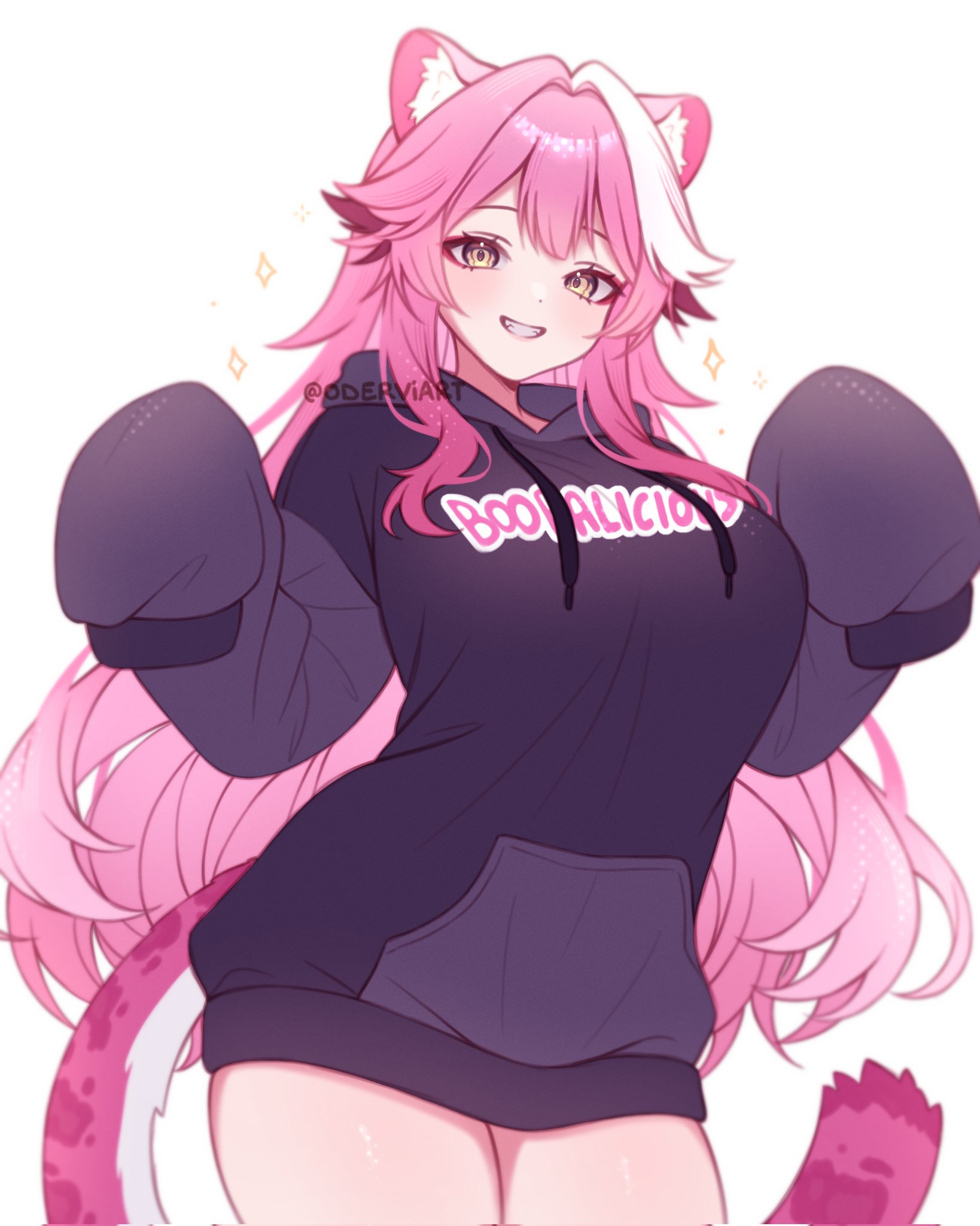 piyopoyo, character request, copyright request, translation request, 1girl, animal ear hairband, animal ears, arms under breasts, artist name, ass, black bow, black bowtie, black leotard, blue eyes, blush, bow, bowtie, breasts, closed mouth, collar, detached collar, fake animal ears, food-themed hair ornament, hair ornament, hairband, leotard, long hair, median furrow, pink hair, playboy bunny, rabbit ear hairband, rabbit ears, rabbit tail, solo, strapless, strapless leotard, strawberry hair ornament, tail, thighhighs, white collar