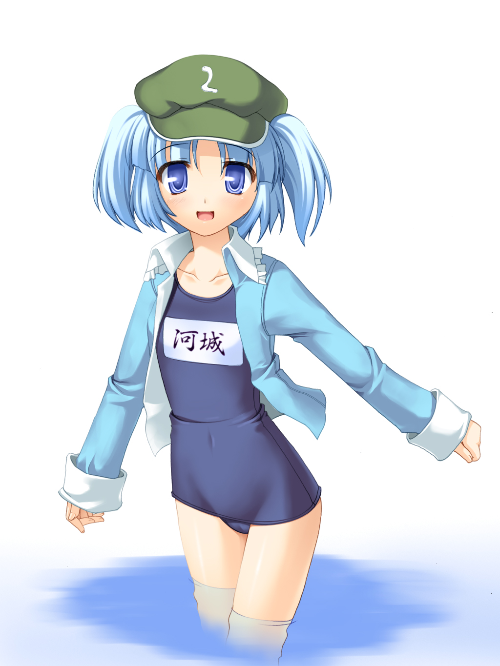 1girlblue hairfemale focushatname tagno pantsone-piece swimsuitopen clothesopen shirtschool swimsuitshirtshort hairsoloswimsuitswimsuit under clothestwo side upwadingwater