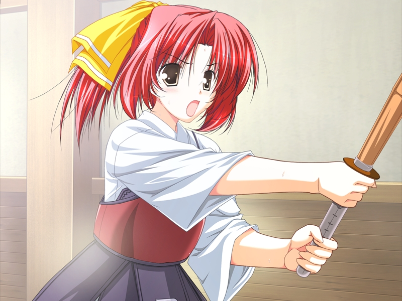 1girlbrown eyesfemale focusjapanese clotheskendoopen mouthponytailred hairshinaishort hairsoloswordweapon