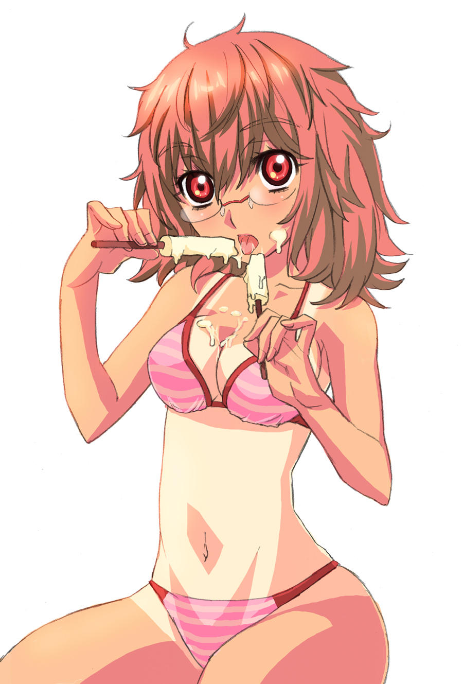 1girlbikinifemale focusfoodfood on bodyfood on faceglassesice creamice cream on facemessy hairone-piece tanpink bikinipink hairpopsiclered eyesrimless eyewearsexually suggestivesimple backgroundsittingsolostriped bikinistriped clothessuggestive fluidswimsuittantanlinetonguewhite background