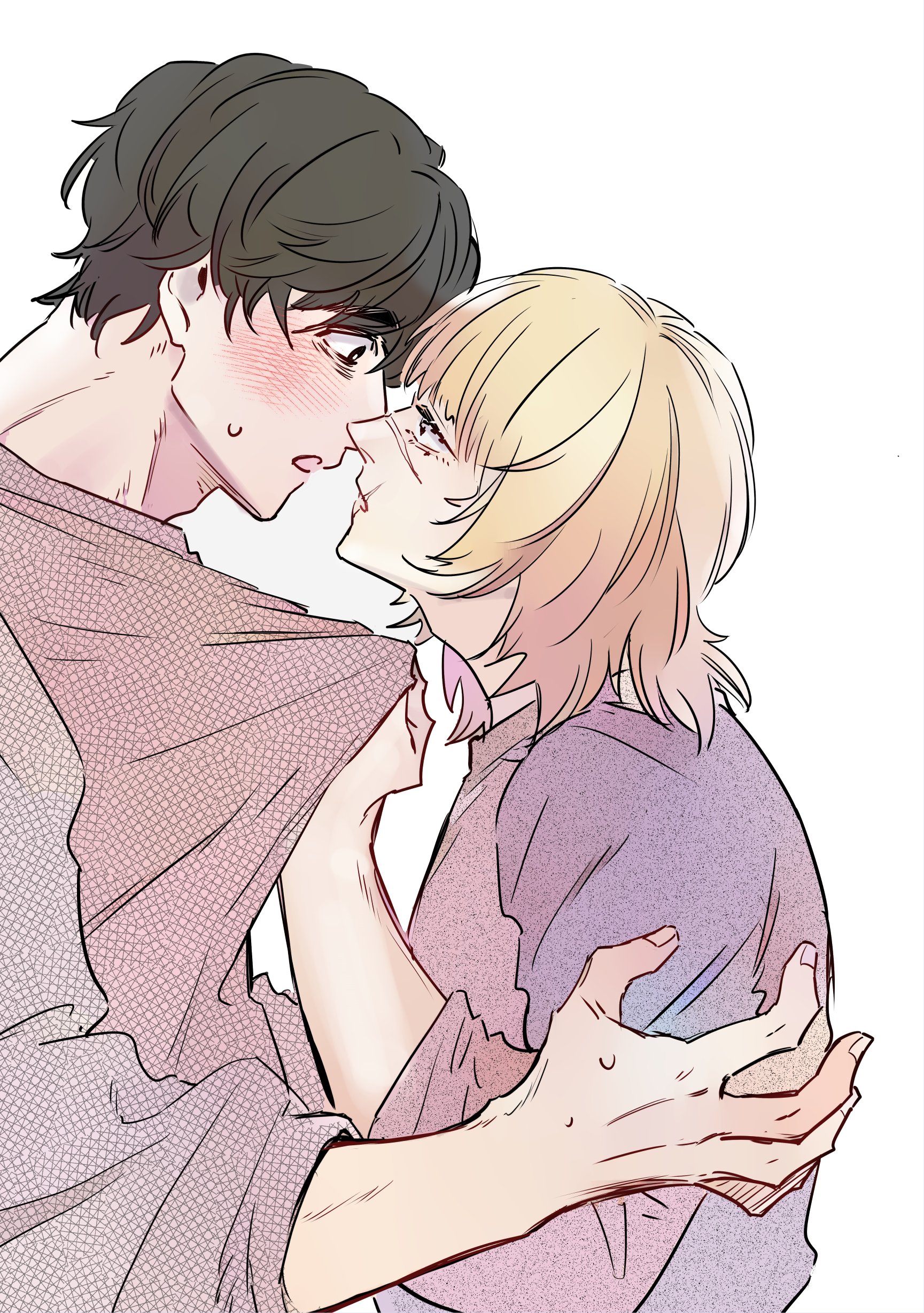 2boysblack hairblonde hairblushbrown shoesclothes grabimminent kisslong sleeveslooking at anothermale focusmedium hairmultiple boysparted lipsscarscar on facescar on mouthscar on noseshirt grabshoesshort hairsweatdropupper bodywhite backgroundyaoiyo shi 365