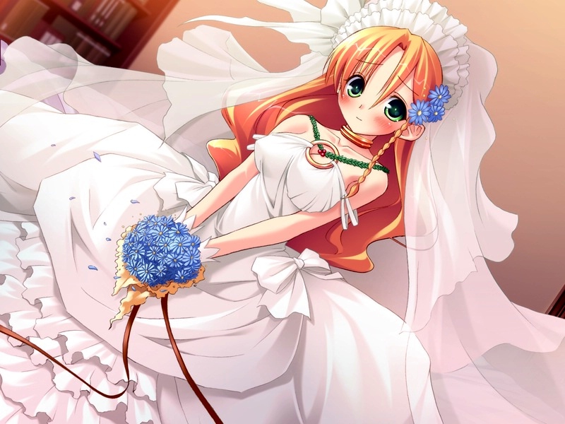 00s1girlblushbookshelfbouquetbowbraidbreastsbridal veilbridechokerdressdutch anglefemale focusflowerfrillsglovesgreen eyeshair flowerhair ornamentlarge breastslong hairorange hairpetalsribbonsee-through clothesside braidsmilesoloveilwedding dress