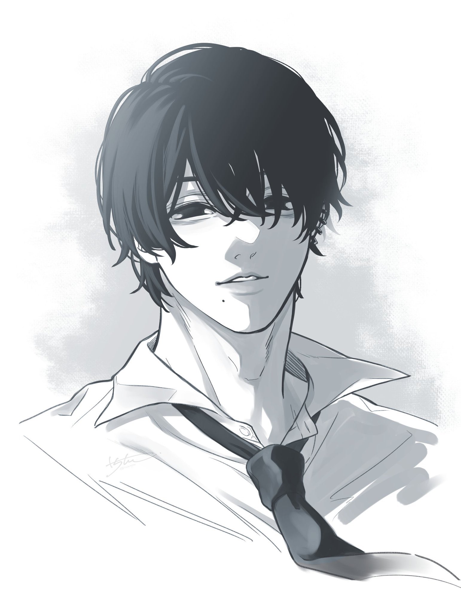 1boyadam's applebuttonsclosed mouthcollared shirtgreyscalehair between eyeshair over one eyelooking at viewermale focusmolemole under mouthmonochromenecktieshirtshort hairsignaturesoloteeth