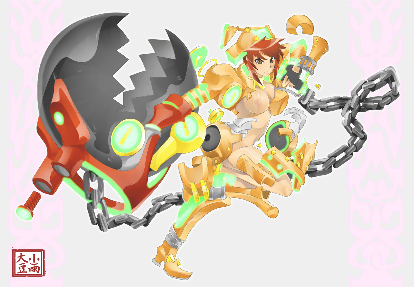 1girlarmorbolt (hardware)breastsbroken armorbrown eyeschainfemale focusglowinghigh heelslarge breastsnipplesnudered hairshoessoloweapon