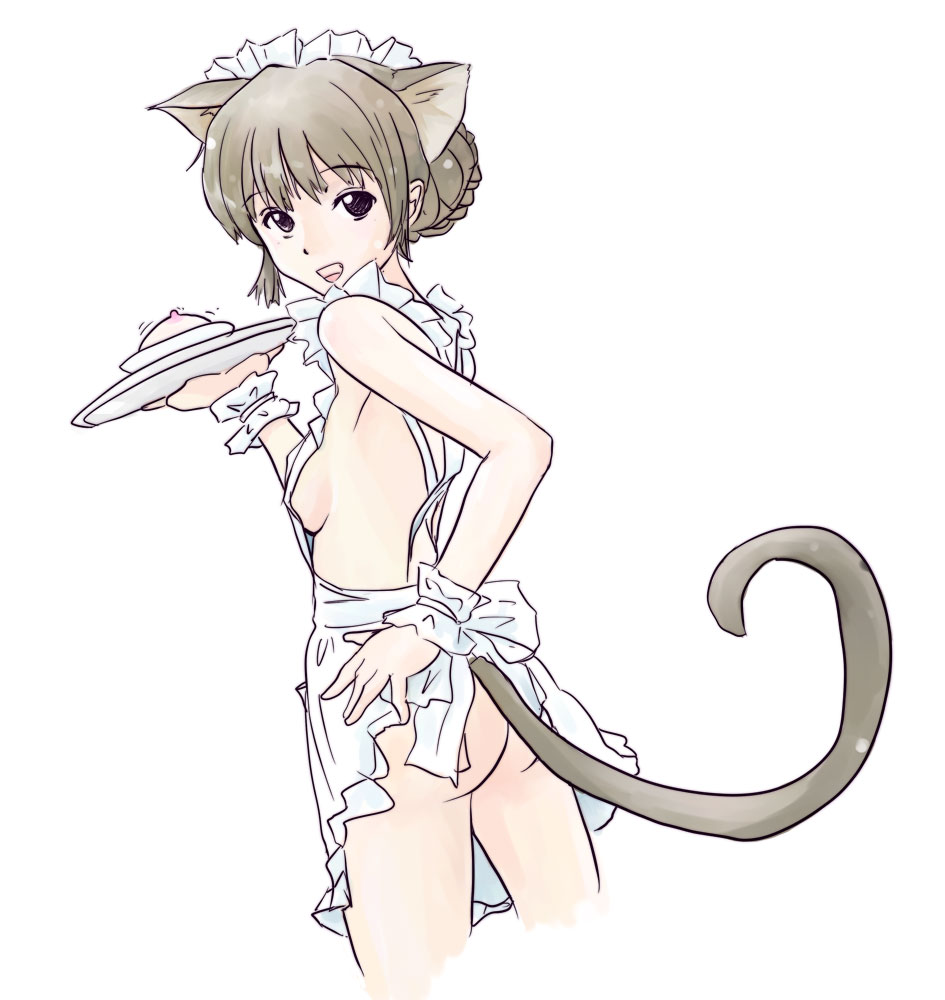 1girlanimal earsapronbreastscat earscat tailfemale focuslooking backnaked apronsideboobsmall breastssolotail