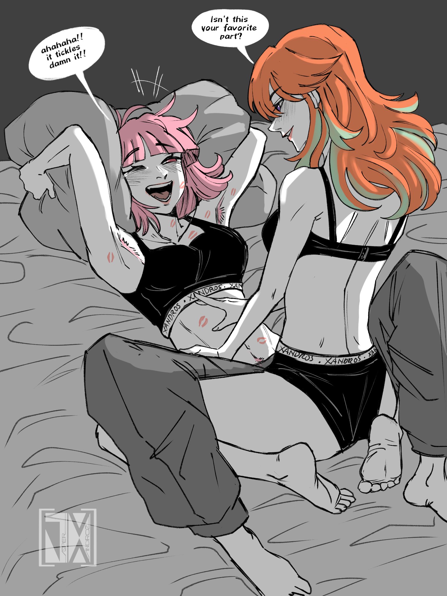 2girlsalternate costumeblushbreastscoupleearringsfeather earringsfeathersgradient hairgreen hairjewelrylarge breastslipstick marklong hairmulticolored hairmultiple girlsopen mouthorange hairpink hairpurple eyessmilestraddlingvirtual youtuberyuri