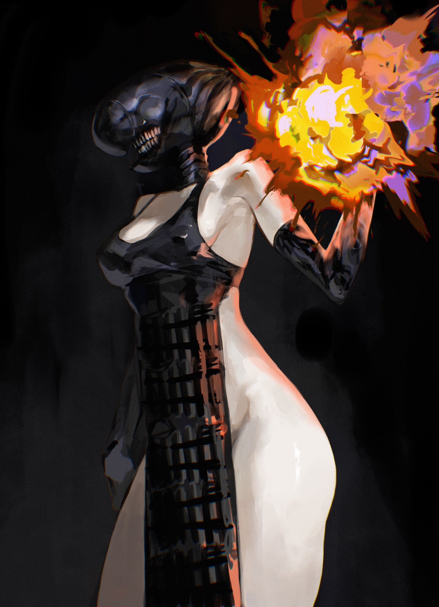 1girlapronblack apronblack backgroundblack brablack glovesbrabreastsclenched teethelbow glovesexplosionexplosiveglovesmedium breastsno pantiessimple backgroundsolostandingteeththighsunderwear