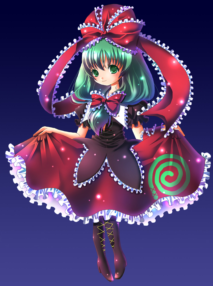 1girlfemale focusfront ponytailfull bodygradient backgroundgreen hairlong hairribbonskirt holdsolostanding