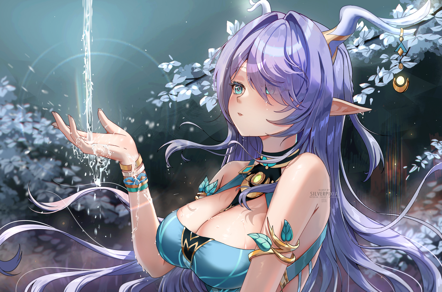 1girlantler ornamentantlersartist namebare shouldersblue eyesblue hairbreastscleavagedeer antlershair over one eyehand uphornslarge breastslong hairparted lipspointy earssleevelesssoloupper bodyvery long hairwater