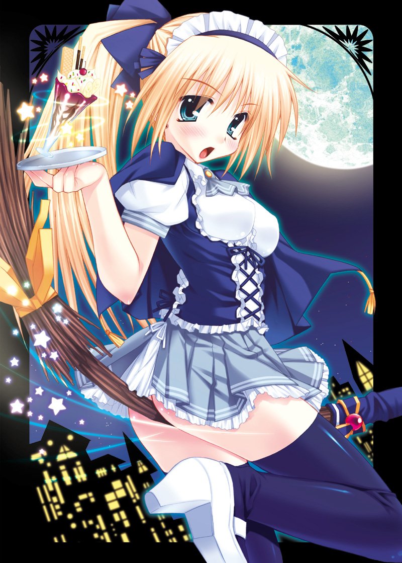 blonde hairblue eyesbroombroom ridingdessertfoodhair ribbonlong hairponytailribbonstar (symbol)thighhighstraywaitresswitchzettai ryouiki