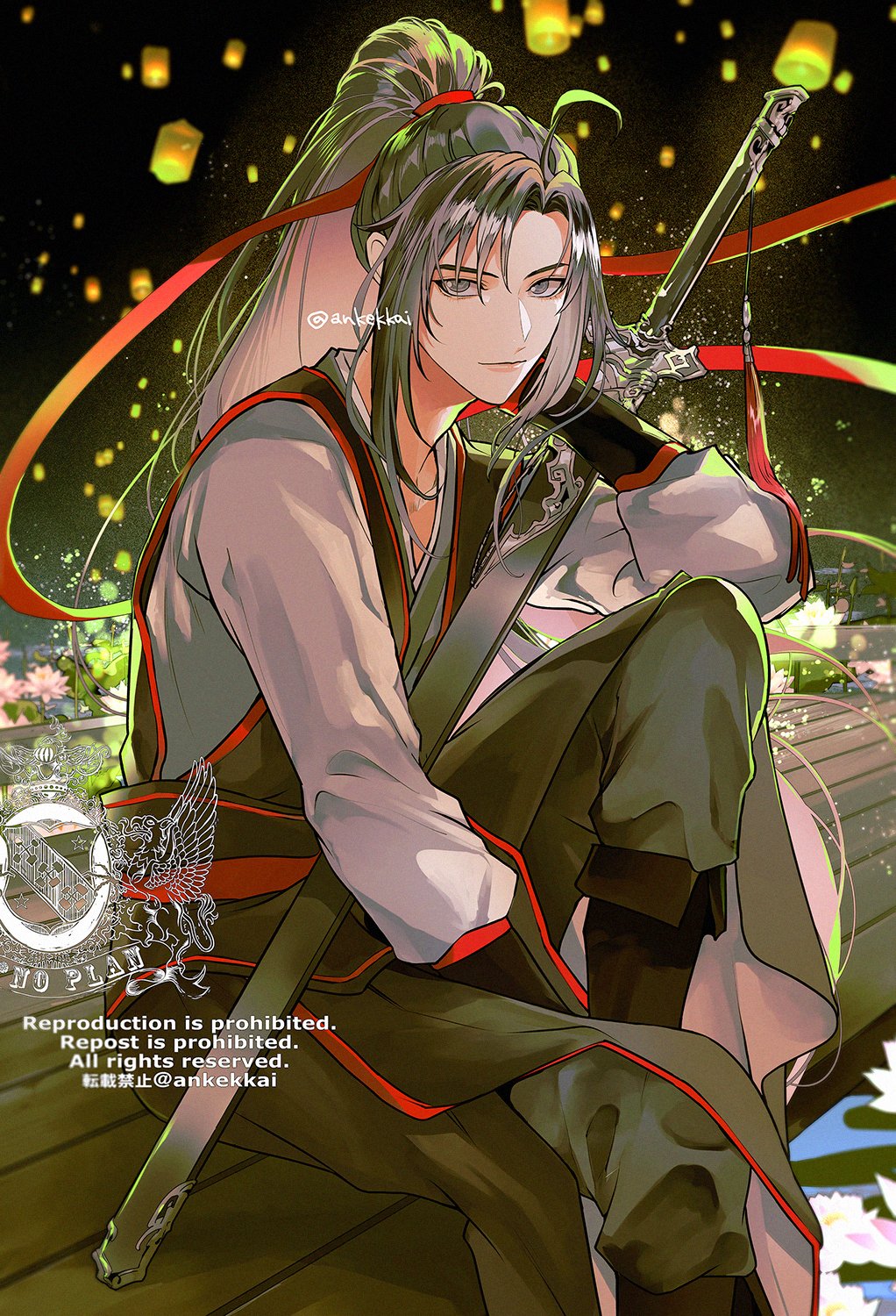 1boyadapted costumeahogebishounenblack bootsblack hairblack hanfublack pantsblack sashbootschinese clothesclosed mouthflowergrey eyeshair ribbonhand on own facehanfuhead restholdingholding swordholding weaponjian (weapon)knee uplanternlantern festivallong hairlong sleeveslooking at viewerlotusmale focusnightnight skyoutdoorspantspaper lanternpierpink flowerponytailred ribbonred sashribbonsashsheathsheathedsidelockssittingskysky lanternsmilesolosuibian swordswordsword tasseltasseltunictwitter usernamewaterwatermarkweapon