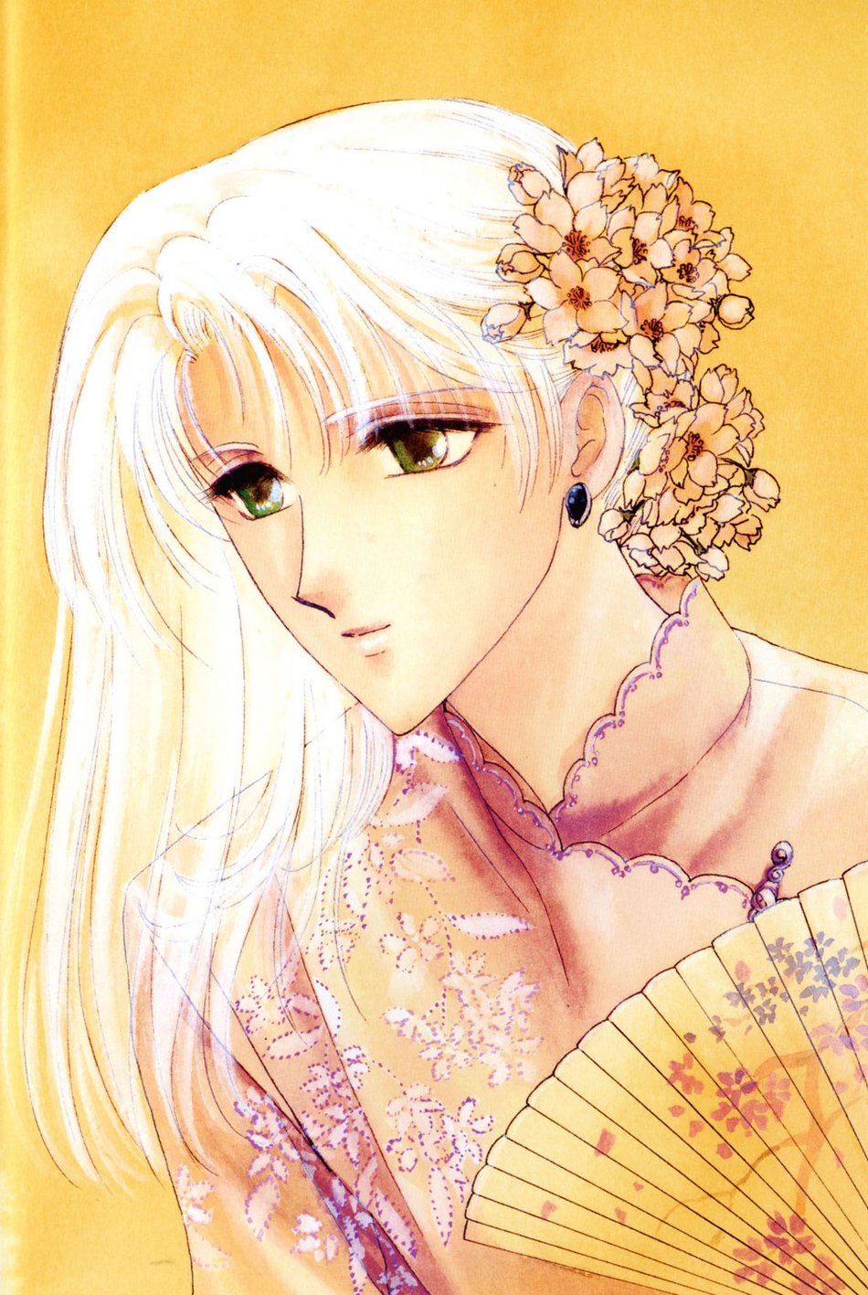 1otherambiguous genderandrogynousearringsflowergreen eyeshand fanjewelrylong hairupper bodywhite hair