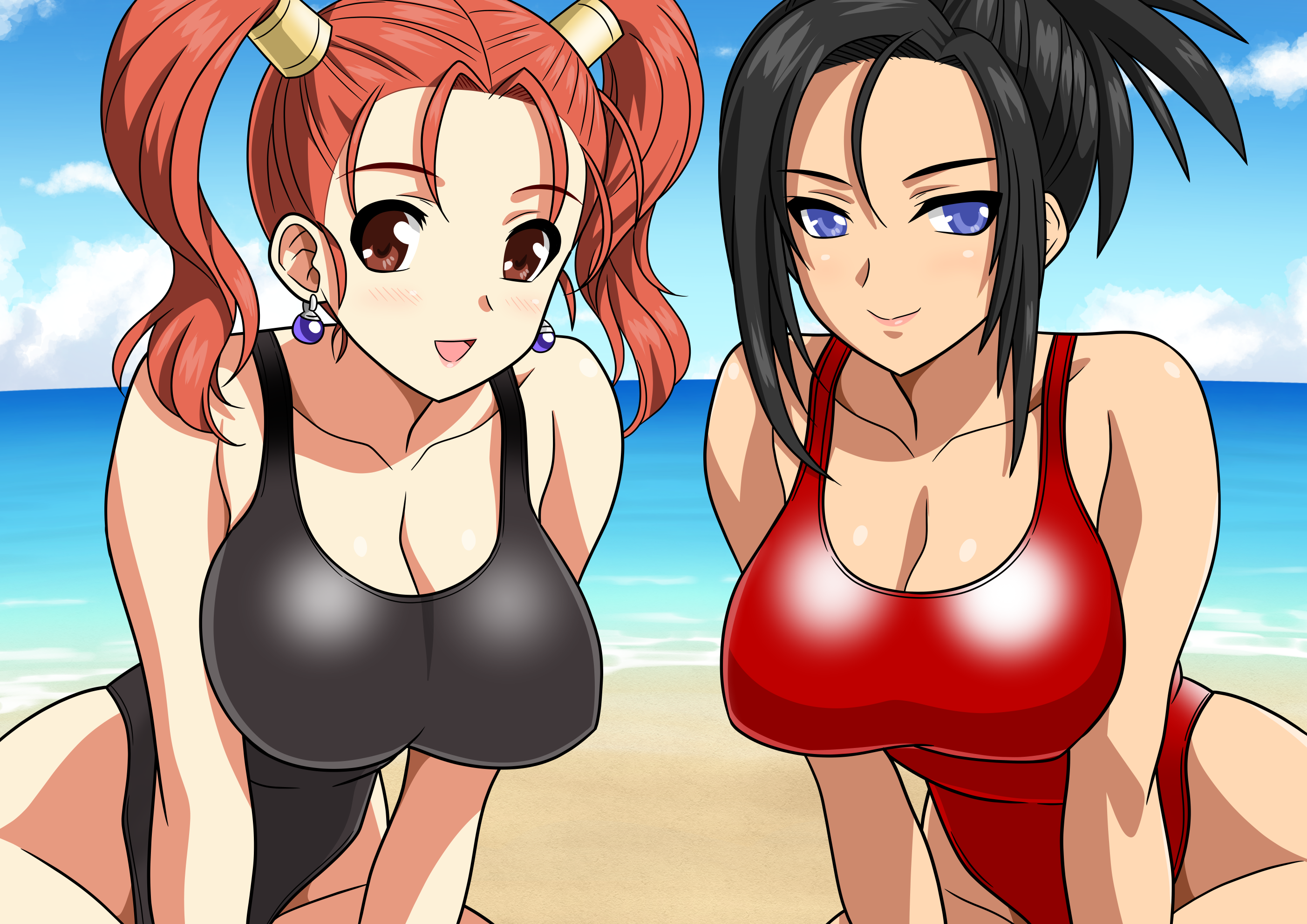 beachblack hairblack one-piece swimsuitblue eyesblue skybreastsbrown eyesbrown haircloudcompetition swimsuitdayearringshair between eyeshorizonjewelrylarge breastsleaning forwardloose hair strandoceanone-piece swimsuitoutdoorsponytailred one-piece swimsuitskyswimsuittwintails