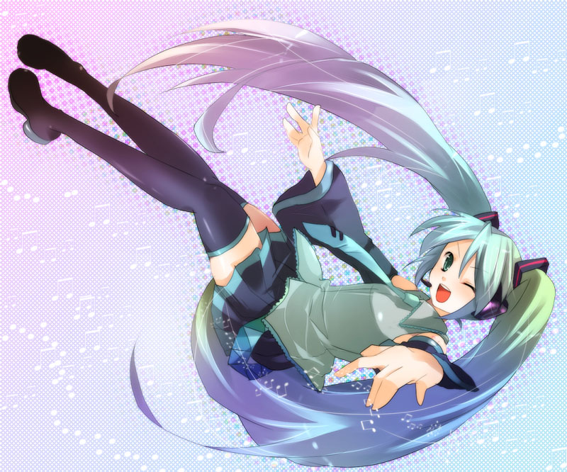 blushdetached sleevesgreen eyesgreen hairheadphoneslong hairmicrophonenecktieone eye closedopen mouthskirtsolothighhighstwintailswinkzettai ryouiki