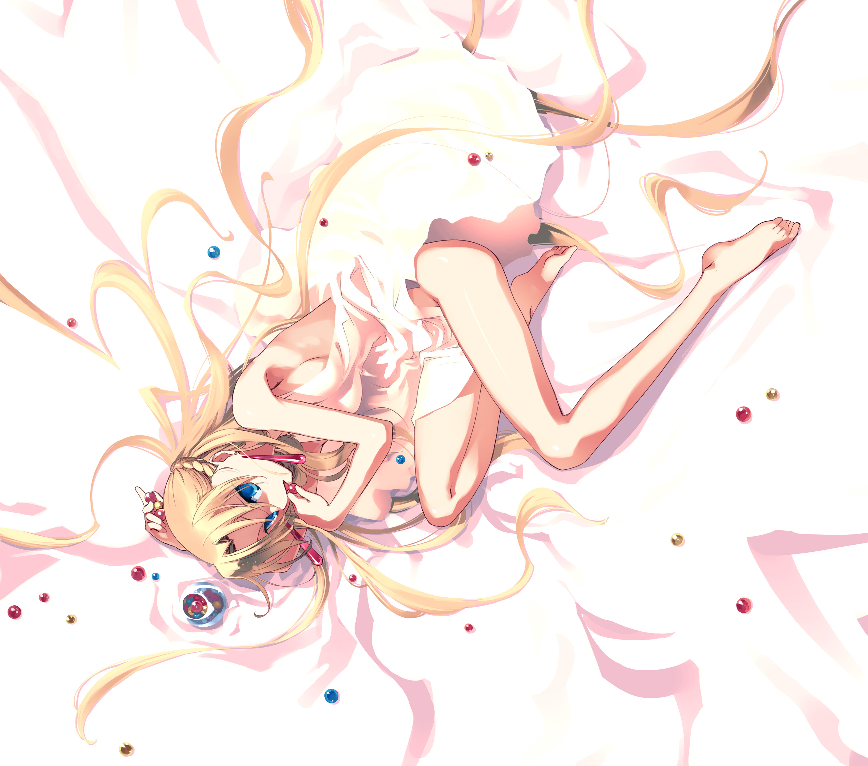 1girlbarefootbedblonde hairblue eyesbreastscandydressearringseatingfeetfemale focusfoodfrom abovejarjewelrylong hairlooking uplyingmedium breastssideboobsolo