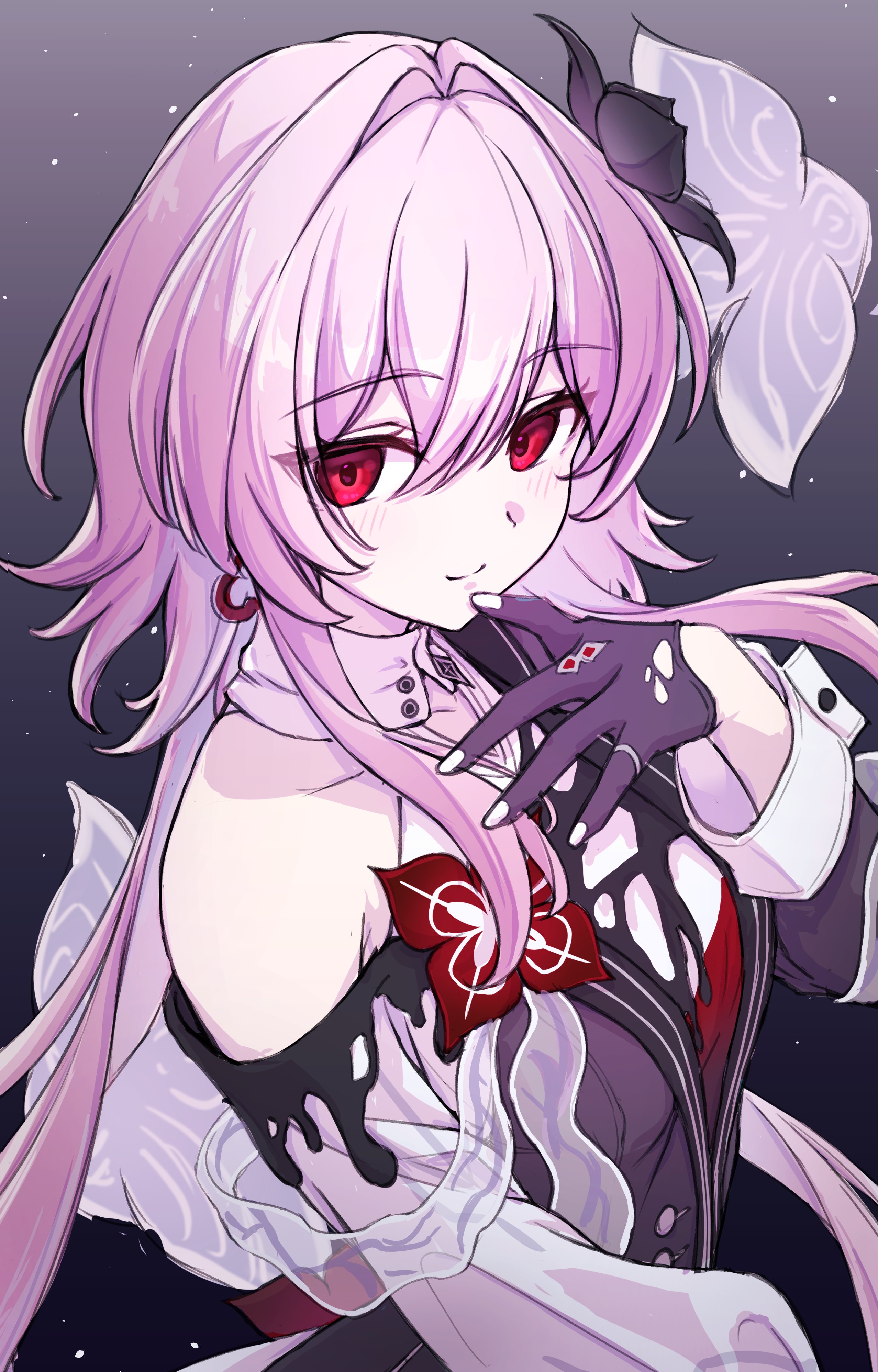 1girlasymmetrical sleevesbare shouldersblack dressblack flowerblack glovesbreastsbuttonscollardressearringsflowergloveshair between eyeshair flowerhair ornamentjewelrylight blushlight smilelong hairlong sleeveslooking at viewermedium breastspink hairred eyesred flowerringsingle earringwhite collar