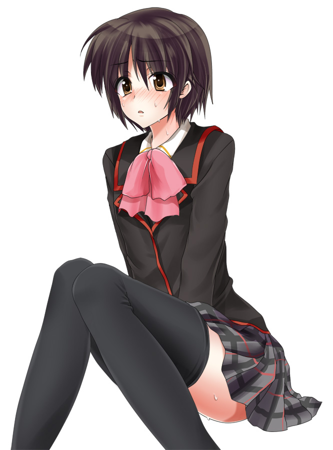 1boyblack thighhighsblushbob cutbowbrown haircrossdressingcrossdressing (mtf)male focuspink bowplaid clothesplaid skirtschool uniformserafukushort hairsittingskirtsolosweatthighhighstrapzettai ryouiki