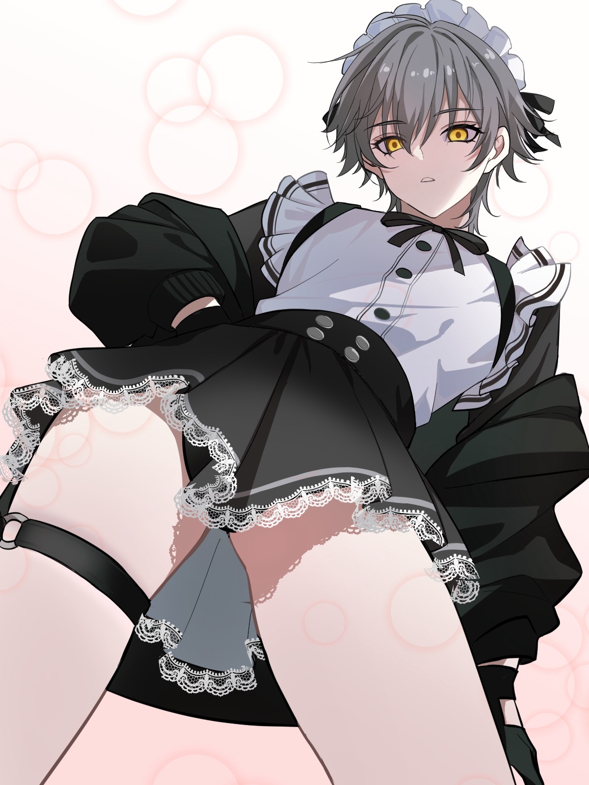 1boyalternate costumeblack glovesblack jacketblack pantiesblack ribbonblack skirtcrossdressingcrossdressing (mtf)fingerless glovesfrilled shirtfrillsfrom belowgarter strapsglovesgradient backgroundgrey hairhair between eyeshand on own hipjacketlacelace trimlace-trimmed skirtlong sleeveslooking at viewerlooking downmaidmaid headdressmale focusminiskirtneck ribbonoff shoulderopen clothesopen jacketpantiespantyshotparted lipspuffy sleevesribbonshirtshort hairsimple backgroundskirtsolostandingsuspendersthigh strapthighstrapunderwearupskirtwhite backgroundwhite shirtyellow eyes