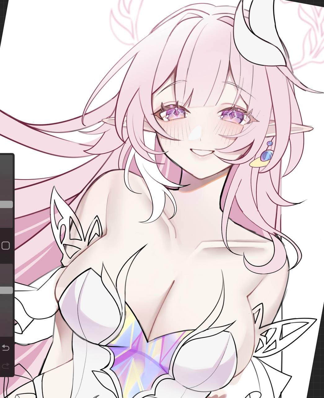 1girlart program in framebare shouldersbreastscleavagecollarbonediamond (shape)diamond-shaped pupilsdressearringshalojewelrylarge breastslong hairlooking at viewermulticolored hairpink hairpointy earspurple eyessimple backgroundsmilesolosymbol-shaped pupilstwo-tone hairupper bodyvery long hairwhite backgroundwhite dresswhite hair