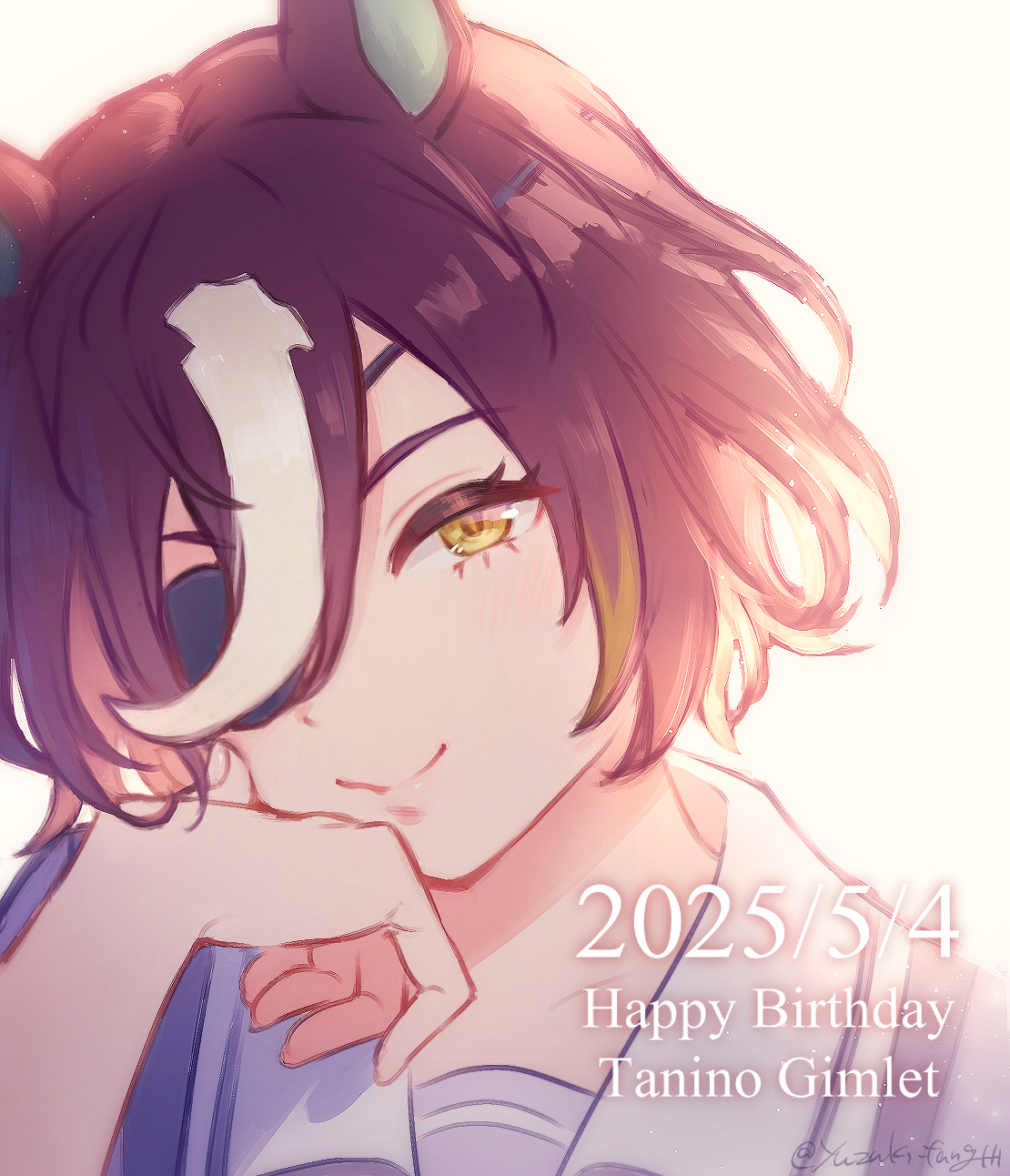 1girlanimal earsbrown backgroundbrown haircharacter nameclosed mouthdatedeyepatchhair over one eyehappy birthdayhorse earsmulticolored hairpuffy sleevespurple shirtschool uniformshirtsimple backgroundsmilesolotracen school uniformtwitter usernametwo-tone hairupper bodyv-shaped eyebrowswhite hairyellow eyes