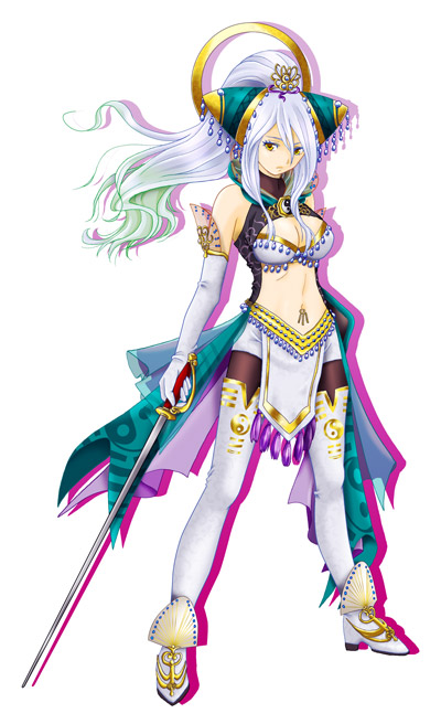 1girlbeltblack pantyhosebreastscleavagefemale focusfull bodyhatholdingholding swordholding weaponlarge breastslegs apartloinclothlooking at viewernavelpantyhoserevealing clothessimple backgroundsolostandingswordtasselweaponwhite background