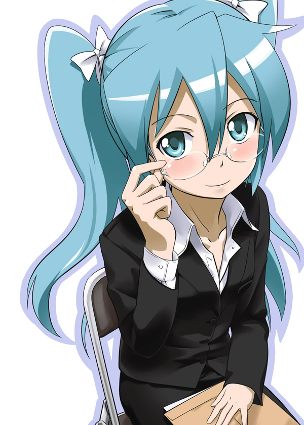 1girladjusting eyewearbespectacledblue eyesblue hairblushbusiness suitfemale focusformal clothesglasseshair ribbonlong hairmatching hair/eyesribbonsittingsolosuittwintails