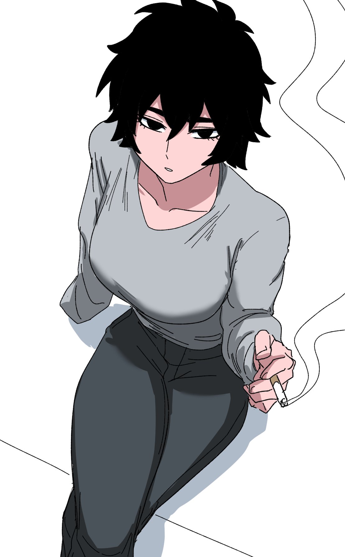 1girlblack eyesblack hairblack pantsbreastscigaretteclenched teethcrossed legsfrom abovegrey shirtholdingholding cigarettelarge breastslooking at viewermuscularmuscular femalepantsparted lipsshirtshort hairsimple backgroundsittingsmokesmokingsoloteethwhite background