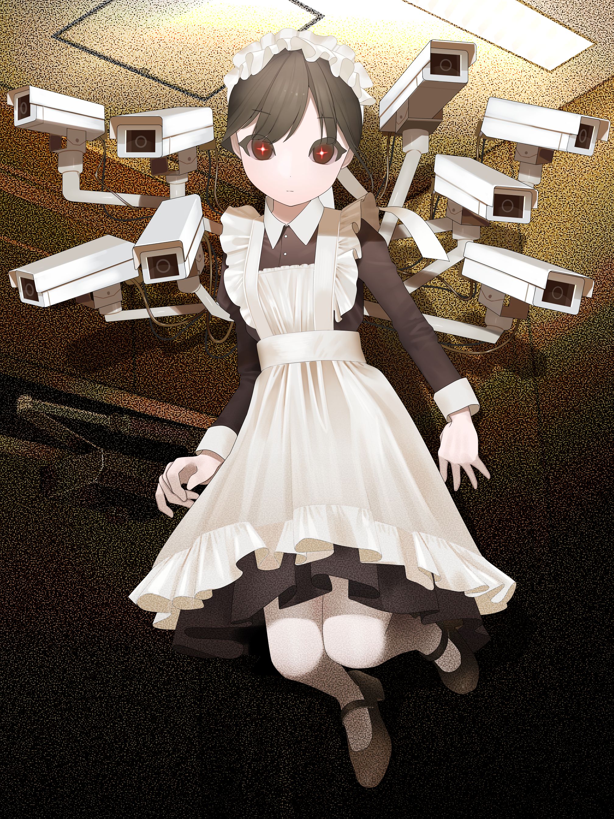 1girlblack hairblack shoescameraceilingceiling lightcross-shaped pupilsempty eyesexpressionlessfloatinglevitationlooking at viewermaidmaid headdresspantyhosered pupilssecurity camerashoesshort hairsolostaticsurrealsymbol-shaped pupilstest norma1white pantyhose