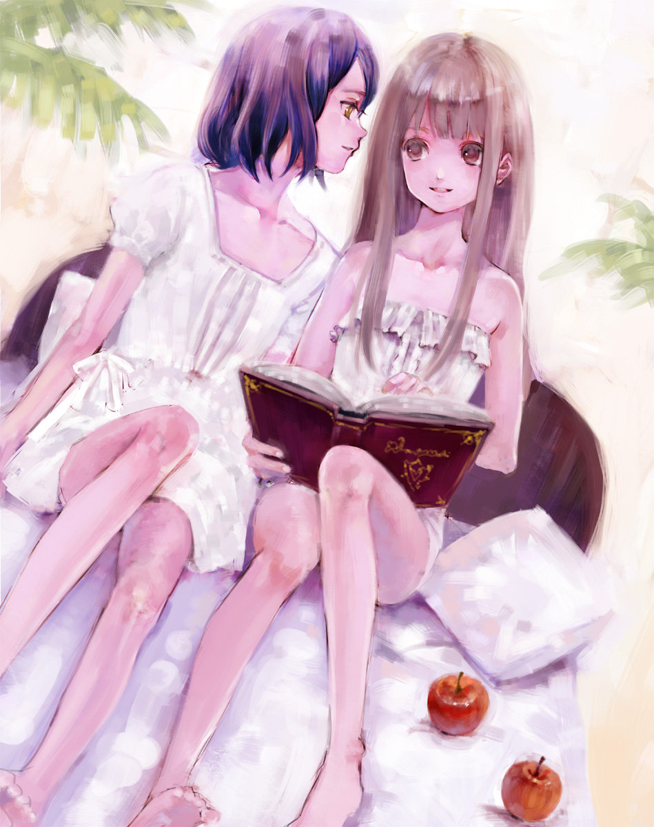 2girlsapplebarefootbedbookbrown hairfeetfoodfruitholdingholding booklong hairmultiple girlsopen bookpurple hairshort hairsittingwhispering